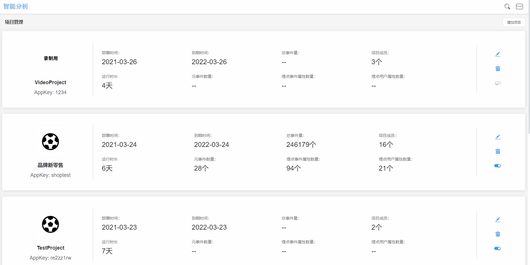 点击项目最右侧操作栏左边的编辑按钮,可对项目名称进行修改,然后点击确认按钮即可。